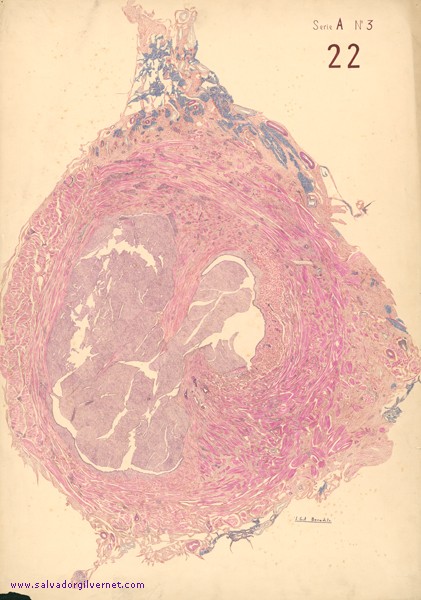Carcinoma vesical infiltrante Serie A-3 Nº 22 Vejiga Corte histotopográfico transversal. Cúpula vesical.Varón adultoTinción HE J. Gil Benedito. Año 1946 Tinta china sobre papel. 99 x 69 cm. Carcinoma urotelial vesical pT2