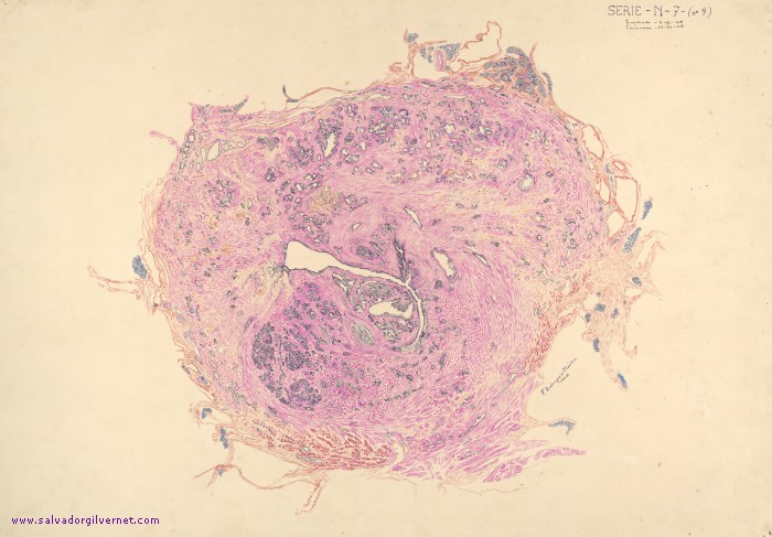 Hiperplasia benigna de próstata Serie N7 Nº 9 Nódulos de HBP en disposición subcervical y periuretral Corte histotopográfico transversal a nivel supramontanalAdultoTinción HE Fernando Rodríguez-Méndez. 1948 Tinta china sobre papel. 50 x 66 cm.