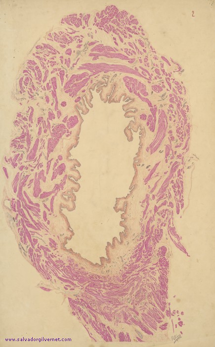 Hipertrofia de las asas musculares detrusorianas Corte histotopográfico sagitalVarón adultoTinción HE R. Arqués. 1944 Tinta china sobre papel. 78 x 49 cm.