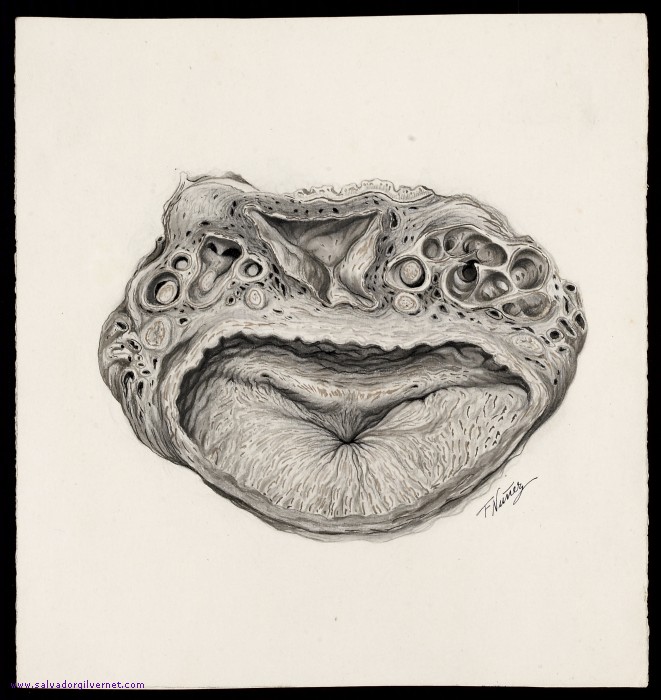Prostatitis tuberculosa Varon adulto F. Nuñez . ca. 1948 Técnica mixta sobre papel. 19 x 18 cm. Tuberculosis de la próstata, ampollas deferenciales y vesículas seminales. Vejiga, ampollas deferenciales y vesículas seminales.