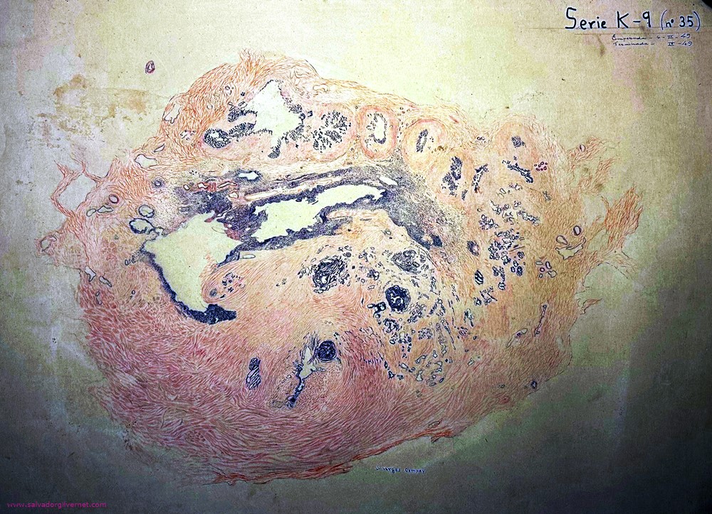 - Sección a nivel de la uretra supramontanal. Gran caverna tuberculosa en la cara posterior y cambios de fibroesclerosis con desaparición de gran parte de los acinos prostáticos.