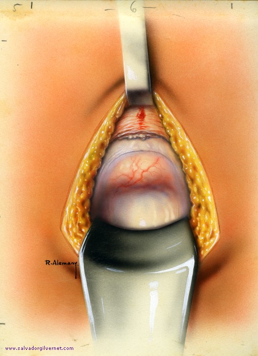 La aponeurosis de Denonvilliers, una vez despegada, es protegida y rechazada hacia atrás por la valva perineal.