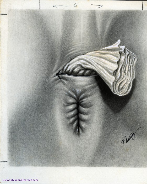 Prostatectomía radical perineal por vía pararrectal R. Alemany. ca. 1944 Técnica mixta sobre papel. 31 x 25 cm. Nota: Corresponde a la fig. 132, pág. 294 del libro “Patología Urogenital. Cáncer de próstata”. Ed. Miguel Servet. Barcelona, 1944. Drenaje y apósito.