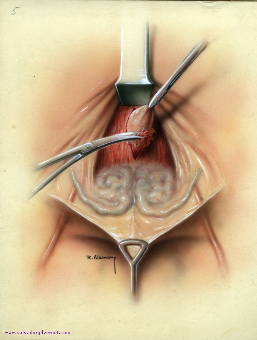 Exéresis de un divertículo de la pared vesical posterior R. Alemany. ca. 1947 Técnica mixta sobre papel. 25 x 21 cm. Disección de la bolsa diverticular.