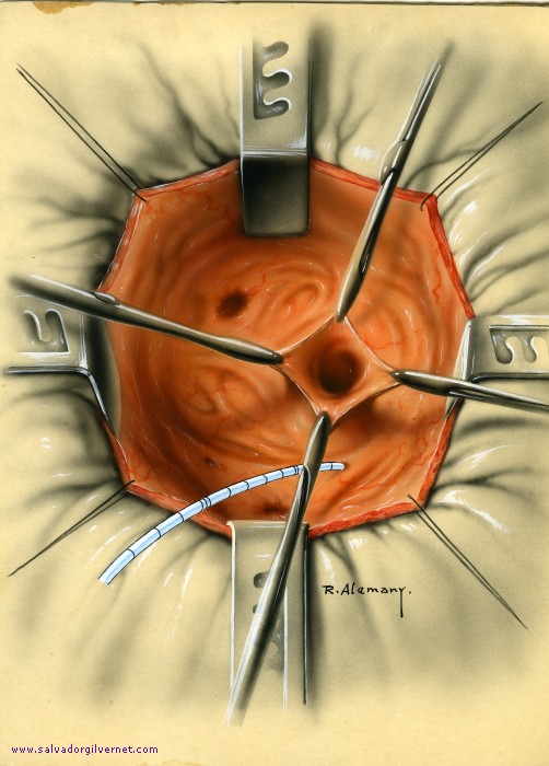 Diverticulectomía transvesical (II) R. Alemany. ca. 1947 Técnica mixta sobre papel. 21 x 17 cm. Tracción del saco diverticular. Catéter ureteral izquierdo