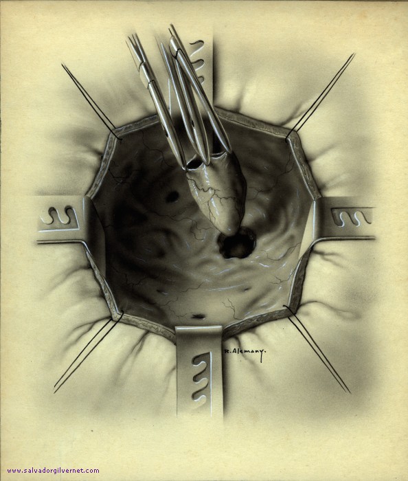 Diverticulectomía transvesical (IIIa) R. Alemany. ca. 1947 Técnica mixta sobre papel. 33 x 28 cm. Exéresis del saco diverticular.