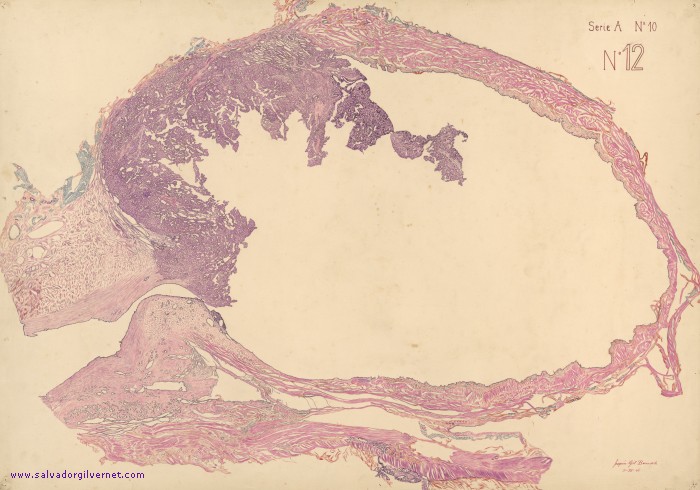 Carcinoma vesical infiltrante Serie A-10 Nº 12 Vejiga Corte histotopográfico sagital. Vejiga y próstata.Varón adultoTinción HE J. Gil Benedito. Año 1946 Tinta china sobre papel. 70 x 100 cm. Carcinoma urotelial vesical pT2