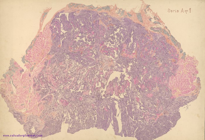 Carcinoma vesical infiltrante Serie A-1 Vejiga Corte histotopográfico transversal. Vejiga.Varón adultoTinción HE De Lara. Año 1946 Tinta china sobre papel. 68 x 100 cm. Carcinoma urotelial vesical pT2