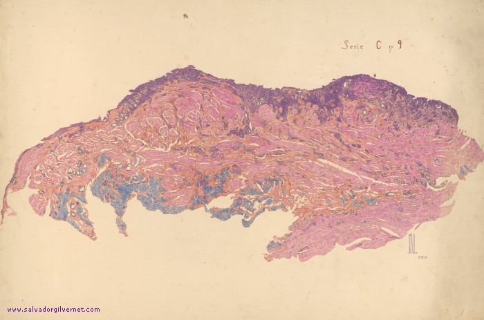 Carcinoma vesical infiltrante Serie C-9 Vejiga Corte histotopográfico sagital. Vejiga.Varón adultoTinción HE D. Campillo. Año 1946 Tinta china sobre papel. 66 x 99 cm. Carcinoma urotelial vesical pT3