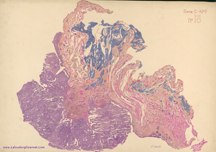 Carcinoma vesical infiltrante Serie C-9 Nº 18 Vejiga Corte histotopográfico sagital. VejigaVarón adultoTinción HE D. Campillo. ca. 1946 Tinta china sobre papel. 70 x 99 cm. Carcinoma urotelial vesical pT3