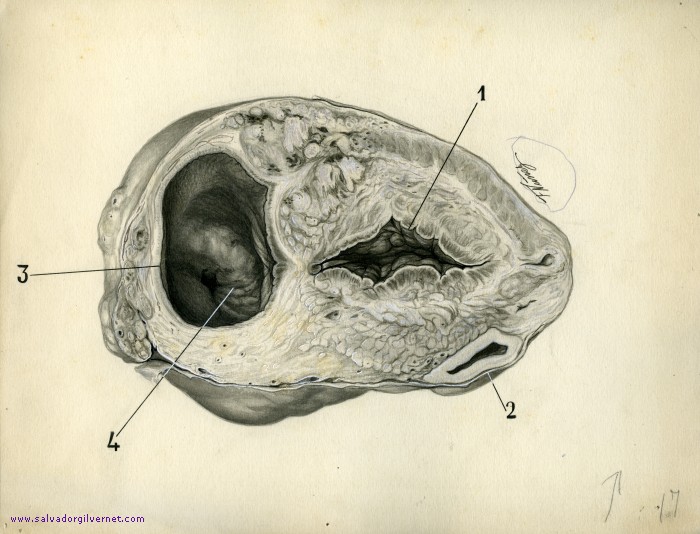 1. Vejiga urinaria en vías de transformación fibrosa. 2. Uréter derecho muy dilatado. 3. Divertículo lateral izquierdo. 4. Tumor carcinomatoso diverticular.