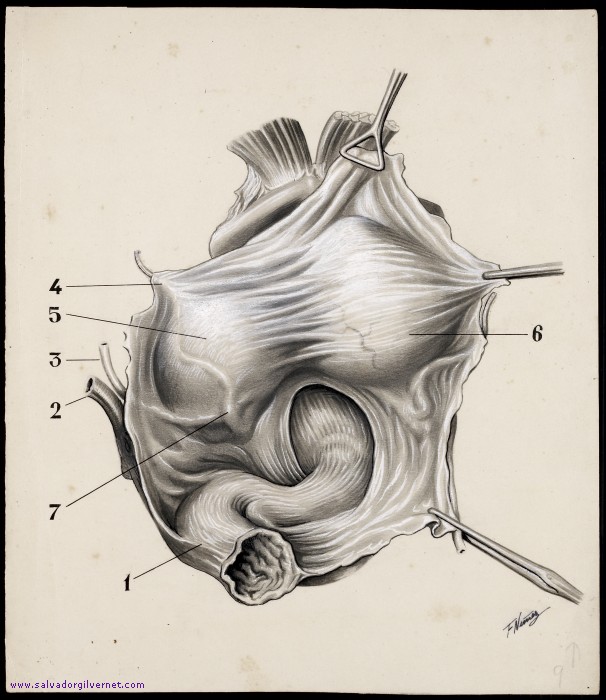- Publicado en el libro Divertículos vesicales (Barcelona, 1948), figura 32, cuyo pie dice así: “1. Recto 2. Arteria hipogástrica 3. Uréter 4. Conducto deferente 5. Divertículo posterolateral recubierto por peritoneo 6. Cara posterior o peritoneal de la vejiga urinaria 7. Cruce del deferente sobtre el uréter”.