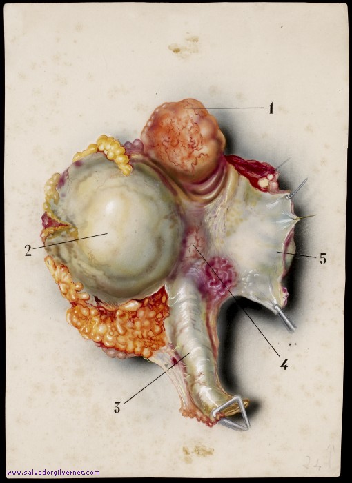 - Publicado en el libro Divertículos vesicales (Barcelona, 1948), figura 42, cuyo pie dice así: "1. Vejiga urinaria. 2. Enorme divertículo posterolateral. 3. Recto, 4. Fondo de saco de Douglas. 5. Peritoneo de la excavación pelviana".
