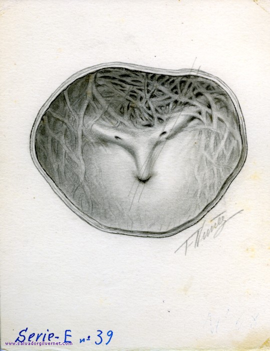 Vejiga Serie E39 Sección transversalAdulto F. Nuñez. ca. 1940 Técnica mixta sobre papel. 16 x 12 cm. Trígono y cuello vesical. Lóbulo medio. Hipertrofia del detrusor.