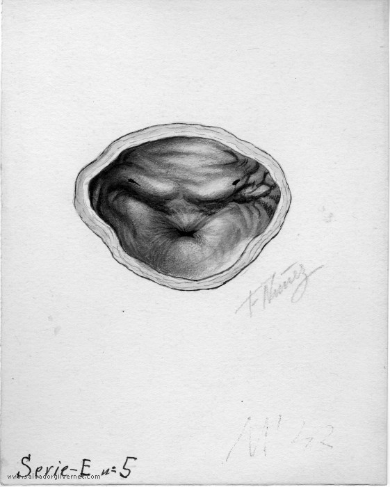 Vejiga Serie E5 Sección transversalAdulto F. Nuñez. ca. 1940 Técnica mixta sobre papel. 16 x 13 cm. Trígono y cuello vesical.