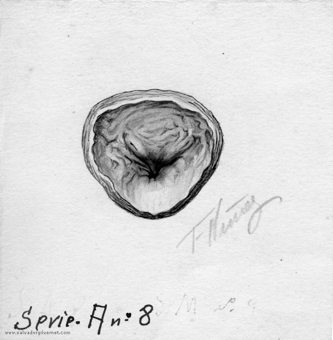 Vejiga Serie A8 Sección transversalAdulto F. Nuñez. ca. 1945 Técnica mixta sobre papel. 11 x 11 cm. Trígono y cuello vesical. Hipertrofia del detrusor.