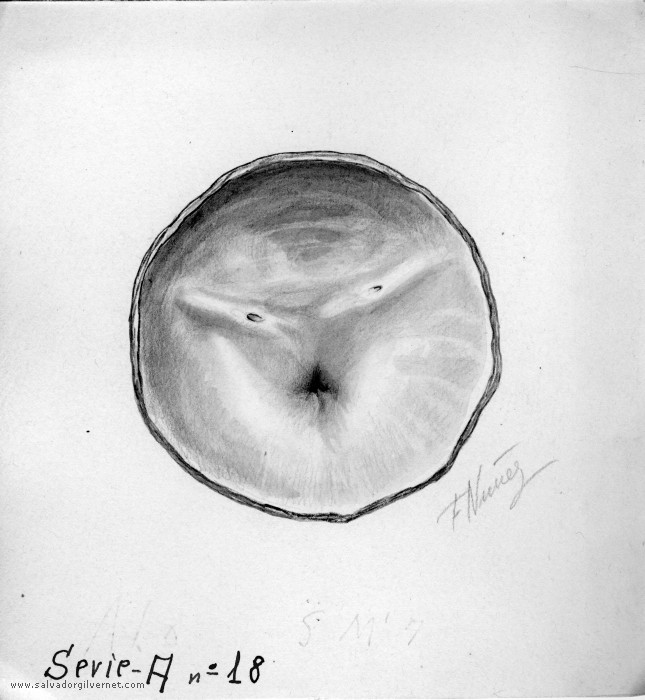 Vejiga Serie A18 Sección transversalVarón adulto de 19 años F. Nuñez. 1947 Técnica mixta sobre papel. 16 x 15 cm. Paciente fallecido por carcinoma testicular metástasico. Trígono y cuello vesical. Vejiga dilatada.