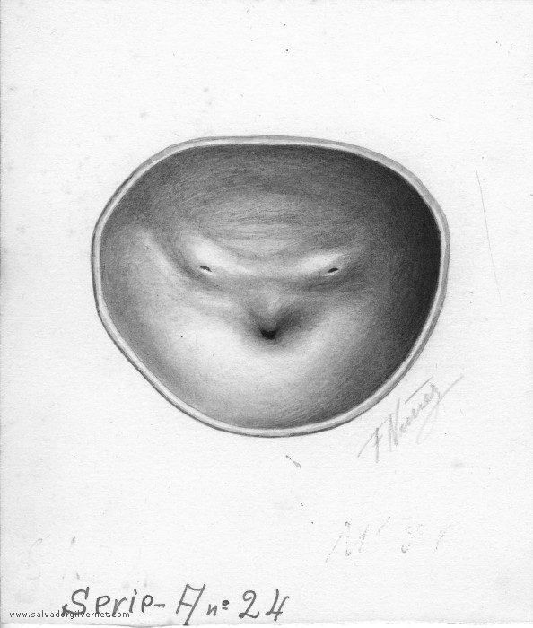 Vejiga Serie A24 Sección transversalVarón adulto F. Nuñez. ca. 1945 Técnica mixta sobre papel. 16 x 12 cm. Trígono y cuello vesical.