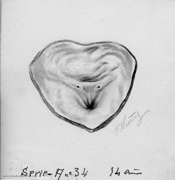 Vejiga Serie A34 Sección transversalVarón adulto de 34 años F. Nuñez. ca. 1948 Lápiz sobre cartulina. 15 x 14 cm. Trígono y cuello vesical.