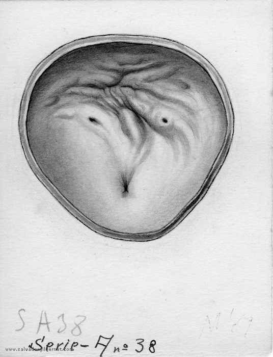 Vejiga Serie A38 Sección transversalVarón adulto F. Nuñez. ca. 1948 Lápiz sobre cartulina. 16 x 12 cm. Trígono y cuello vesical.