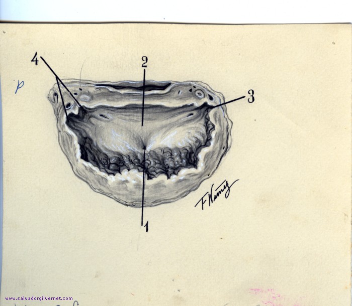 Vejiga Serie G19 Sección transversalAdulto F. Nuñez. ca. 1940 Técnica mixta sobre papel. 12 x 15 cm. Trígono y cuello vesical.