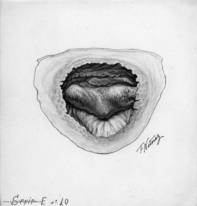 Vejiga Serie E10 Sección transversalVarón adulto F. Nuñez. ca. 1948 Lápiz sobre cartulina. 17 x 16 cm. Trígono y cuello vesical. Lóbulo medio. Hipertrofia del detrusor.