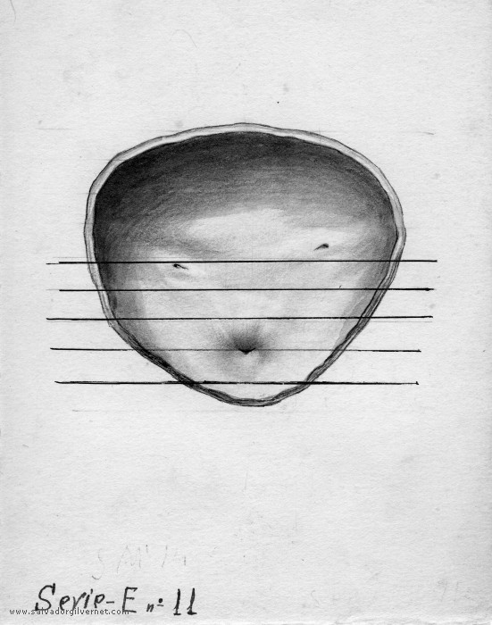 Vejiga Serie E11 Sección transversalVarón adulto F. Nuñez. ca. 1948 Lápiz sobre cartulina. 16 x 13 cm. Trígono y cuello vesical.
