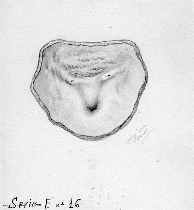 Vejiga Serie E16 Sección transversalVarón adulto F. Nuñez. ca. 1948 Lápiz sobre cartulina. 13 x 12 cm. Trígono y cuello vesical. Lóbulo medio. Hipertrofia del detrusor.