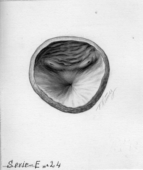 Vejiga Serie E24 Sección transversalVarón adulto F. Nuñez. ca. 1948 Lápiz sobre cartulina. 15 x 13 cm. Trígono y cuello vesical. Hipertrofia del detrusor.