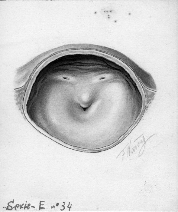 Vejiga Serie E34 Sección transversalVarón adulto F. Nuñez. ca. 1948 Lápiz sobre cartulina. 15 x 13 cm. Trígono y cuello vesical. Lóbulo medio prostático. Hipertofia del detrusor.