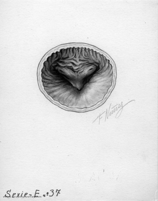 Vejiga Serie E37 Sección transversalVarón adulto F. Nuñez. ca. 1948 Lápiz sobre cartulina. 16 x 13 cm. Trígono y cuello vesical. Hipertofia del detrusor.
