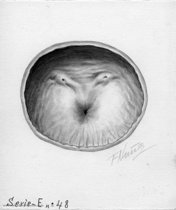 Vejiga Serie E48 Sección transversalVarón adulto F. Nuñez. ca. 1948 Lápiz sobre cartulina. 15 x 13 cm. Trígono y cuello vesical. Lóbulo medio prostático. Hipertrofia del detrusor.