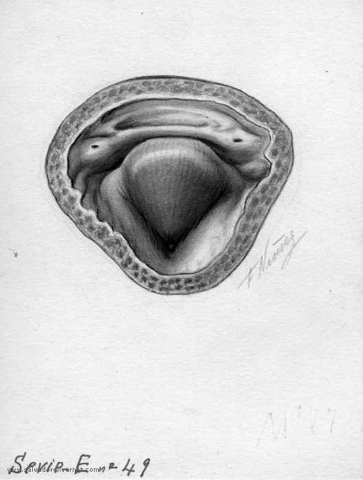 Vejiga Serie E49 Sección transversalVarón adulto F. Nuñez. ca. 1948 Lápiz sobre cartulina. 16 x 12 cm. Trígono y cuello vesical. Lóbulo medio prostático. Hipertrofia del detrusor.