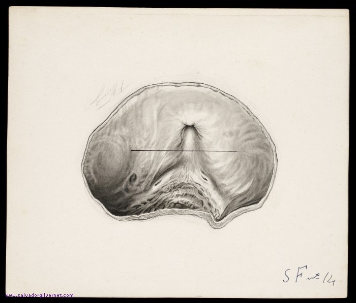 Vejiga Serie F14 Sección transversalVarón adulto F. Nuñez. ca. 1948 Técnica mixta sobre cartulina. 18 x 22 cm. Trígono y cuello vesical. Lóbulo medio prostático. Hipertrofia del detrusor.