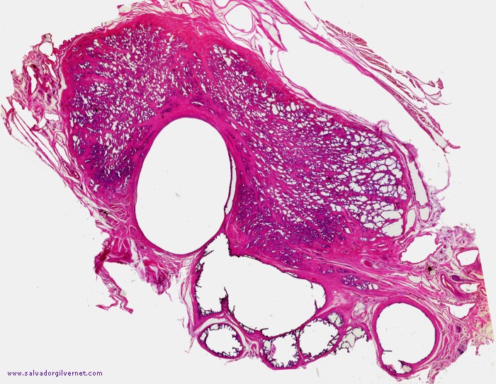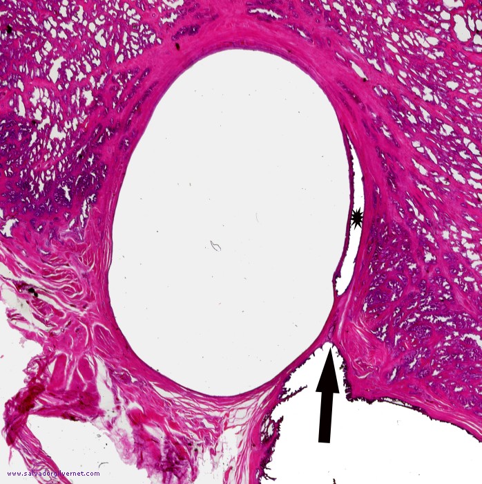 Detalle 1: Porción proximal del conducto eyaculador derecho dilatada (flecha) y porción intraprostática del conducto eyaculador (asterisco) comprimida por el quiste utricular Quiste utricular Serie R-1 Pieza de necropsia Sección frontal oblicua que interesa la porción proximal del conducto eyaculador derecho, ampolla deferencial y vesícula seminal derecha. Quiste de utrículo y porción proximal del conducto eyaculador, ampolla deferencial y vesícula seminal muy dilatados (Detalle 1)Tinción HE ca. 1945