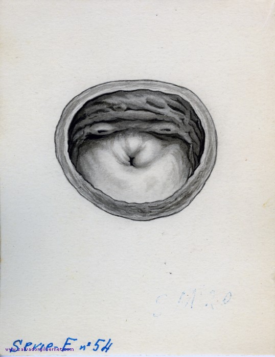 Vejiga Serie E54 Sección transversal.Adulto F. Nuñez. ca. 1940 Técnica mixta sobre papel. 16 x 12 cm. Trígono y cuello vesical. Hipertrofia del detrusor.