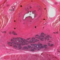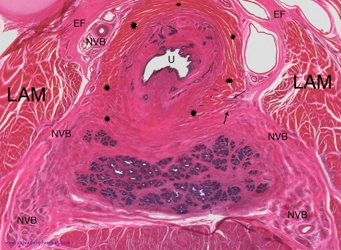 Detalle 2: Hoja visceral de la fascia endopélvica (EF). Haces neurovasculares (NVB). Esfínter uretral externo (asteriscos). Uretra prostática inframontanal (U). Músculo elevador del ano (LAM). Fibras nerviosas del haz neurovascular derecho dando ramas que penetran en el esfínter uretral externo (flechas).