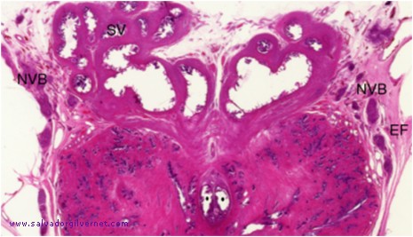 Detalle 2: Vesículas seminales (SV) y ampollas deferenciales. Conductos eyaculadores (puntos negros). Haces neurovasculares (NVB) con ganglios del plexo pelviano, perivesiculares y prostáticos. Hoja visceral de la fascia endopélvica (EF) atravesada por ganglios y nervios de los haces neurovasculares.